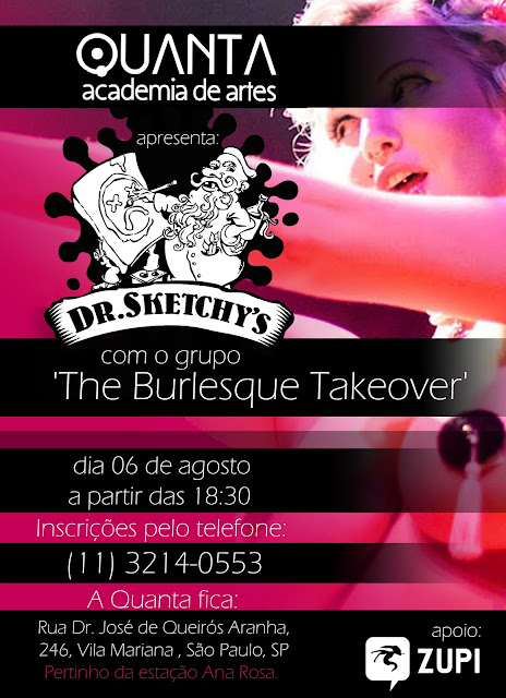 Dr. Sketchy's branch at São Paulo, Brazil. A escola de arte se encontra com o Cabaret. Para que desenhar modelo vivo em classes de arte monótonas quando você pode experimentar a arte tal como Toulouse Lautrec, e ainda por cima ganhar prêmios, ouvir boa música e se divertir ?